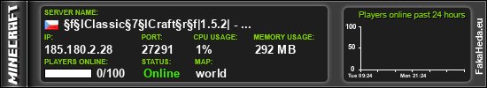 | Wasabi.eu | Survival - Dungeony - Ranky | 2 | 50 | public | 1.21.4 | 185.180.2.37:27829 | on |