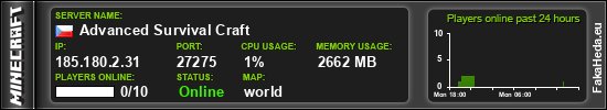 | Advanced Survival Craft | 0 | 10 | public | 1.21.10 | 185.180.2.31:27275 | on |