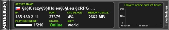 | §a§lCrazy§9§lHoles§6§l.eu §cRPG - Survival, SkyBlock, Oneblock. | 1 | 210 | public | 1.21.11 | 185.180.2.11:27375 | on |