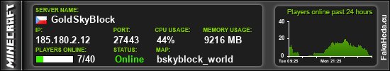| GoldSkyBlock Skyblock pro vášnivé stavitele | 29 | 50 | bungee | 1.8.x-1.21.x | 185.180.2.13:27978 | on |