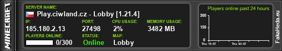 | Play.ciwland.cz - Lobby [1.21.4] | 0 | 300 | public | 1.21.10 | 185.180.2.13:27498 | on |