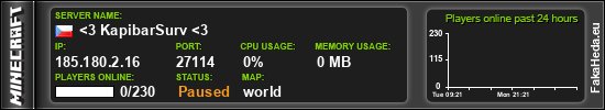 | <3 KapibarSurv <3 | 0 | 230 | white list | 1.19.2 | 185.180.2.16:27114 | on |