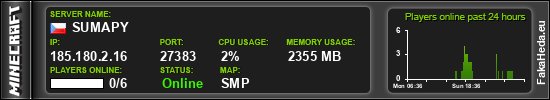 | SUMAPY | 0 | 6 | public | 1.21.11 | 185.180.2.16:27383 | on |