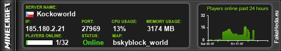 | Kockoworld | 0 | 32 | public | 1.21.8 | 185.180.2.21:27969 | on |