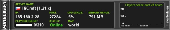 | HiCraft [1.21.x] | 0 | 210 | white list | 1.21 | 185.180.2.28:27284 | on |