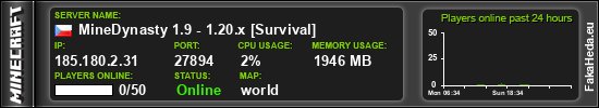 | MineDynasty 1.9 - 1.20.x [Survival] | 0 | 50 | public | 1.21.11 | 185.180.2.31:27894 | on |