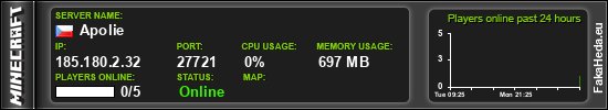 | Apolie | 0 | 5 | public | 1.21.11 | 185.180.2.32:27721 | on |