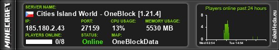 | play.citiesislandworld.cz - OneBlock [1.21.4] | 0 | 300 | public | 1.21.4 | 185.180.2.43:27159 | on |