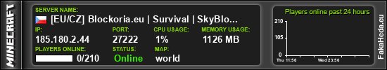 | [EU/CZ] Blockoria.eu | Survival | SkyBlock | 1.21.x | 0 | 210 | white list | 1.21.11 | 185.180.2.44:27222 | on |