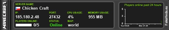 | Chicken Craft | 0 | 5 | public | 1.8.8 | 185.180.2.48:27432 | on |