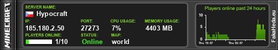 | Hypocraft | 2 | 10 | public | 1.21.11 | 185.180.2.50:27273 | on |